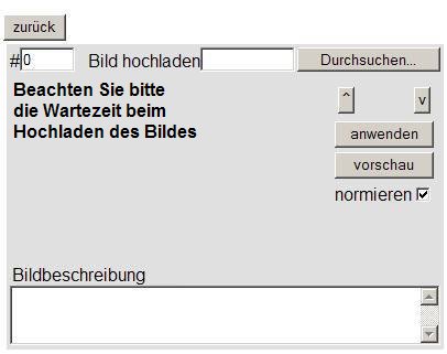 durchsuchen | Ein Dateibrowser wird gestartet mit dem Sie auf Ihrem lokalen Datenträger ein Bild auswählen können. Die Wahl wird automatisch in das Feld Bild hochladen übernommen. |